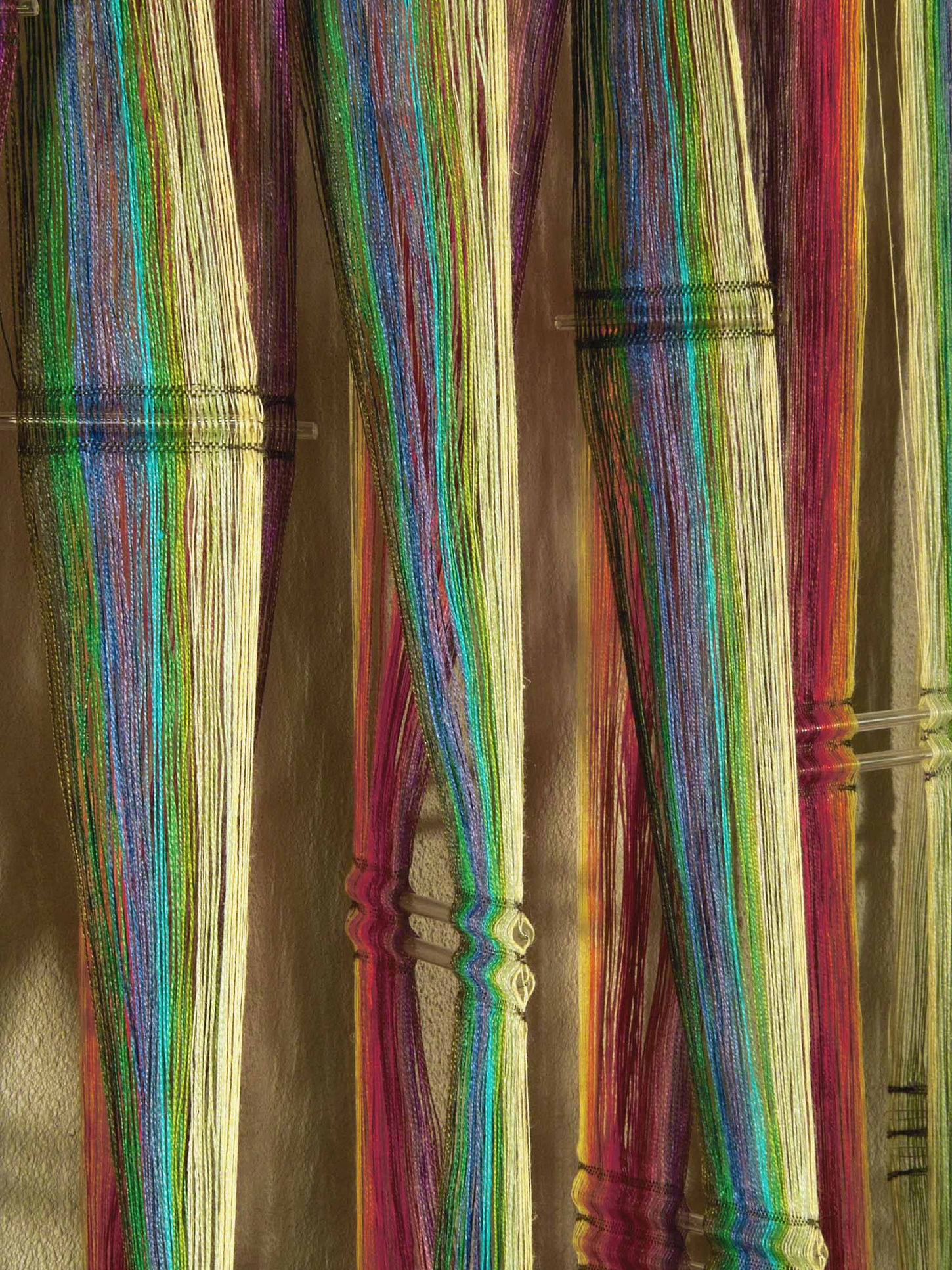 The colorful bulb fields that Rita Kok and her husband, Wim Kok (1938-2018), saw in the spring during their travels through the Bulb Region inspired her to create this textile artwork. It is woven from colored linen threads mounted around Perspex rods, creating a three-dimensional effect. Rita Kok created this artwork, part of the collection, in 2011, commissioned by the De Witte Zwaan Foundation. Rita Kok began weaving in the 1970s. Experimenting with different weaving techniques led her to her free textile art. Kok combines supple, natural yarns of linen, wool, and silk with more resilient materials such as Perspex, fishing line, metal wire, horsehair, and rubber. With these, she pushes the boundaries of weaving and gradually discovers which patterns she can create between the different materials. Her experimental wall hangings initially brought her great fame in Japan. She received an invitation to participate in the 16th International Arts Festival in Kyoto, where her woven artworks earned her the Jury Prize Award. Numerous exhibitions followed, both domestically and internationally.