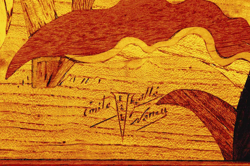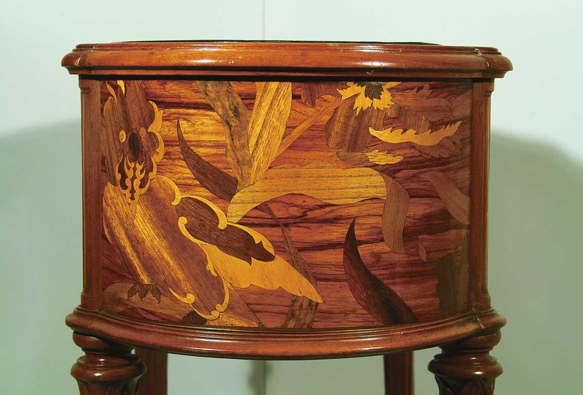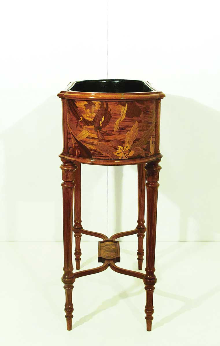De jardinière, oftewel plantenbak, in De collectie de Witte Zwaan is gemaakt van notenhout en heeft een zinken binnenbak. De jardinière staat op vier hoge poten, welke iets taps toelopen naar onderen. De vier poten worden met elkaar verbonden met een dubbele schoor. De jardinière in de collectie De Witte Zwaan is gedecoreerd met hoog kwaliteit inlegwerk met allerlei tulpen en vogels in de Art Nouveau stijl. De jardinière is op de voorkant gesigneerd: Émile Gallé Nancy.