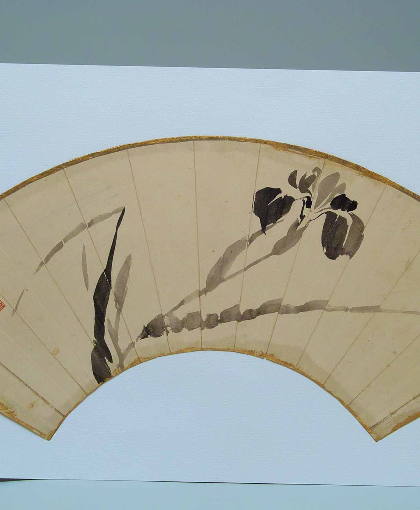 Kawabata Gyokusho (1842-1913) werd geboren in Kyoto in een familie van lakschilders. Op jonge leeftijd bleek Kawabata een talent voor schilderen te hebben. Vanaf zijn elfde kreeg hij les van de bekende schilders Nakajima Raisho en Oda Kai. In 1866 verhuisde Kawabata naar Tokyo, waar hij zich als zelfstandig kunstenaar vestigde. Hij wist zich binnen enkele jaren op te werken tot een van de leidende figuren in de kunstwereld van Tokyo. In 1878 begon hij zijn eigen schilderschool. De faam van Kawabata wist hem zelf tot het Keizerlijk paleis te brengen, waar hij tot hofschilder werd uitgeroepen. De waaier in de Collectie De Witte Zwaan is een voorbeeld van de tekenstijl sumi-e, waarbij enkel nog zwarte inkt werd gebruikt om de tekening te maken. Met name landschapsschilderingen werden hierdoor populaire onderwerpen voor de waaiers. Op het oppervlak van de waaier is in het midden een grote iris-decoratie in verschillende tinten zwarte inkt aangebracht in simpele maar sierlijke lijnen.