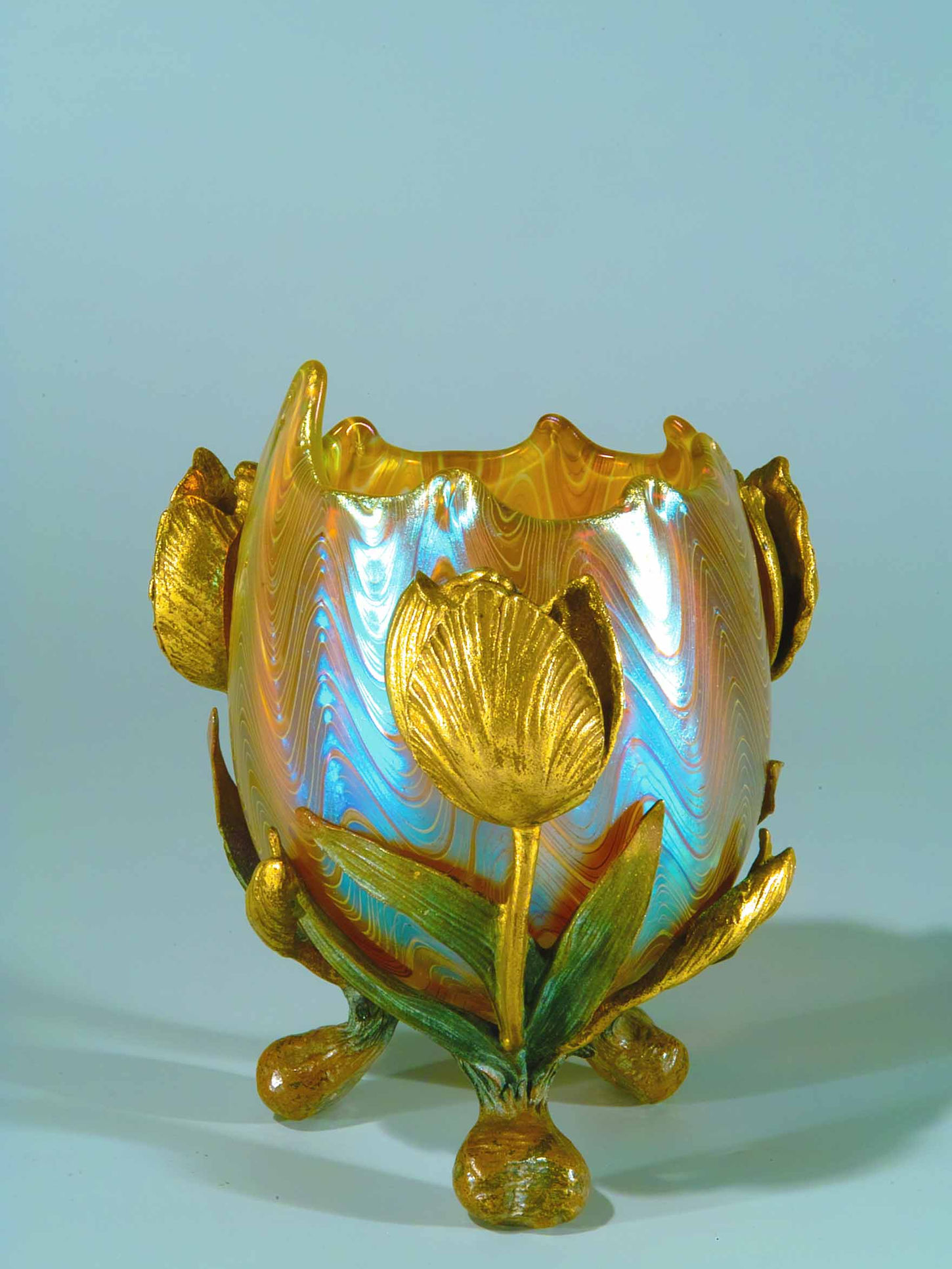 Loetz iriserend glazen vaas met verguld montuur van tulpen en tulpenbladeren